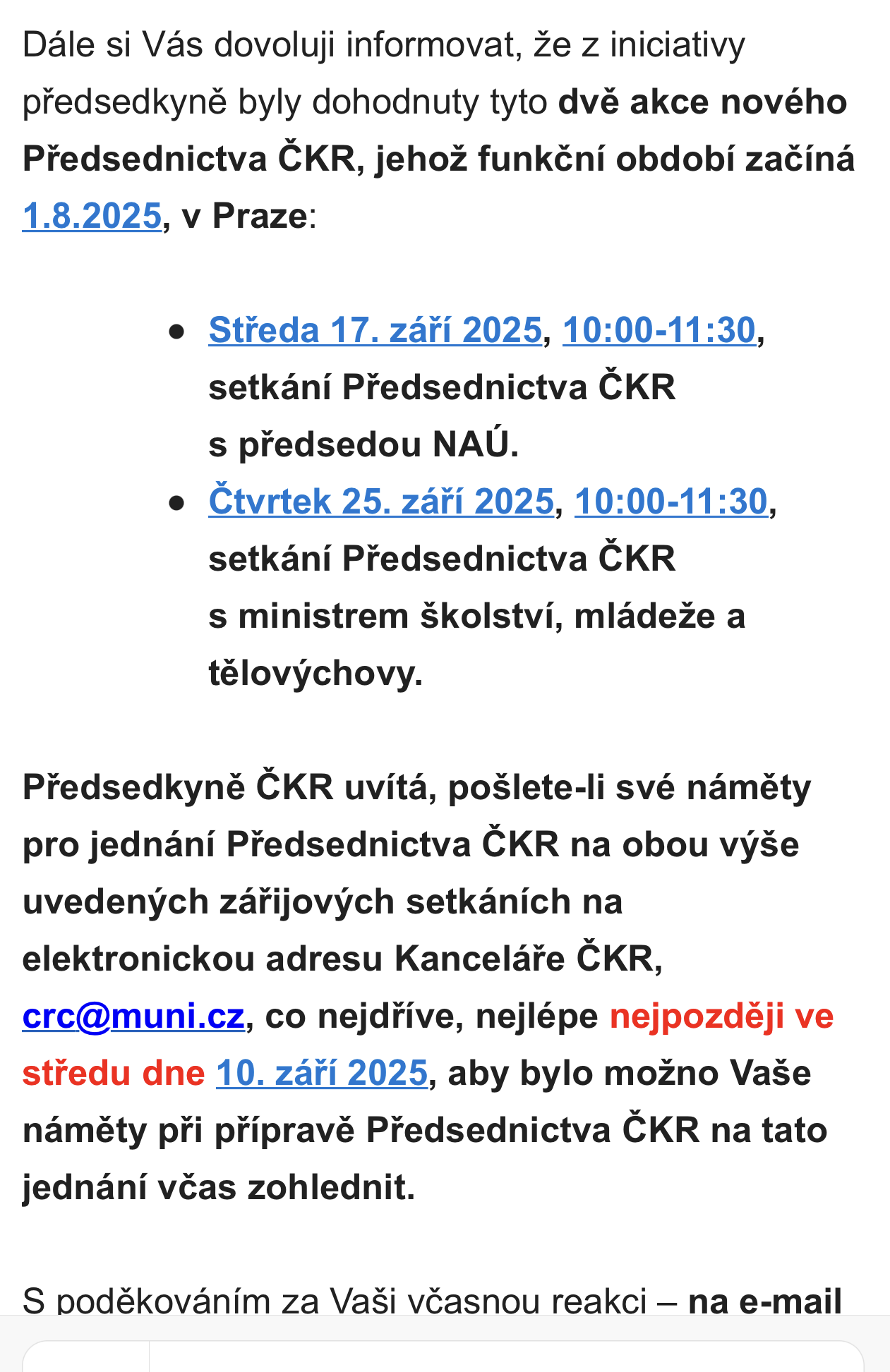 rektorka VŠZ doc. PhDr. Jitka Němcová, PhD. se zúčastnila setkání Předsednictva České konference rektorů s ministrem školství, mládeže a tělovýchovy Mikulášem Bekem (pozvánka) |