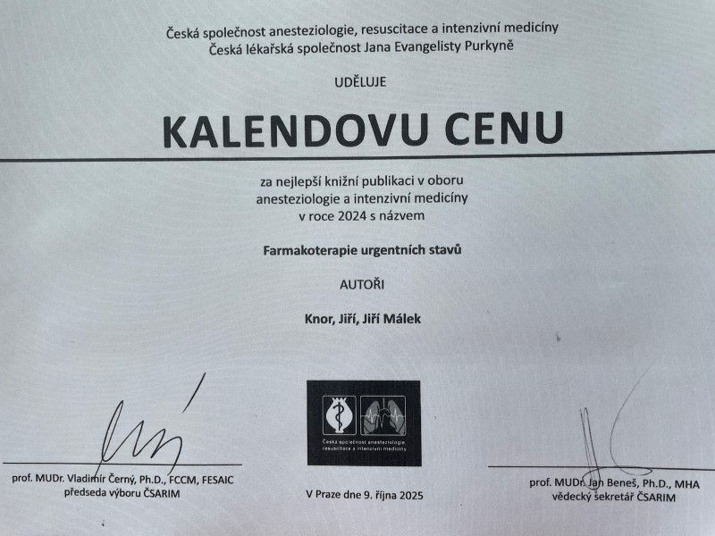 doc. MUDr. Jiří Knor, PhD. získal Kalendovu cenu, kterou uděluje Česká společnost anesteziologie, resuscitace a intenzivní medicíny České lékařské společnosti J. E. Purkyně za nejlepší knižní publikaci v oboru anesteziologie a intenzivní medicíny Farmakologie urgentních stavů (ocenění) |